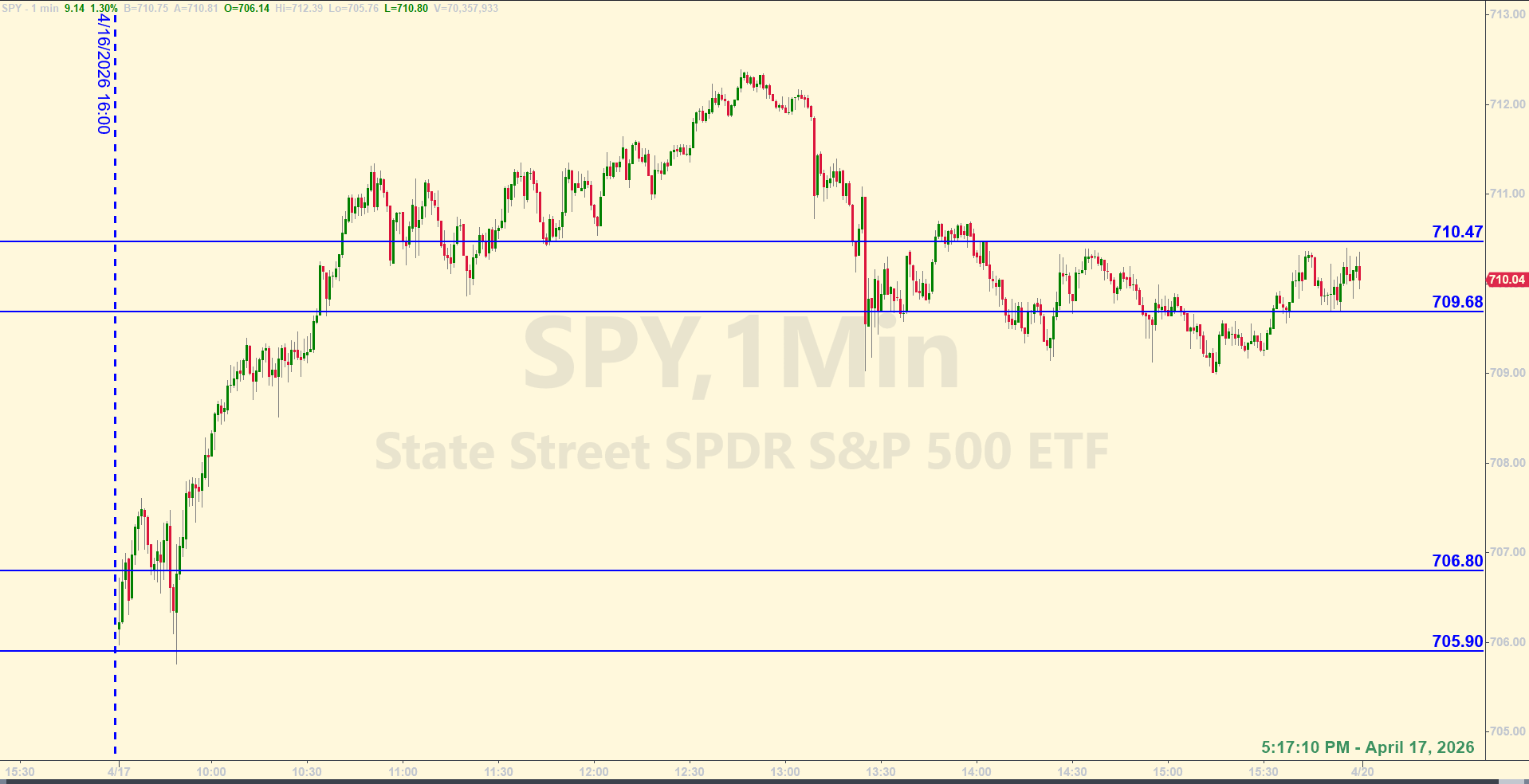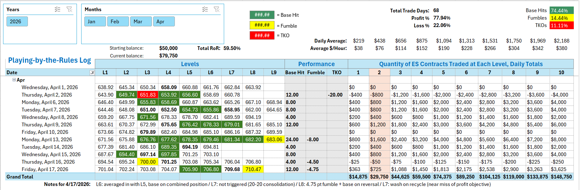Trading by the Ticks & Trades Strategy, a total of 7.25 ES points for the day. See notes for 4/17/2026 in Tracking Log below.