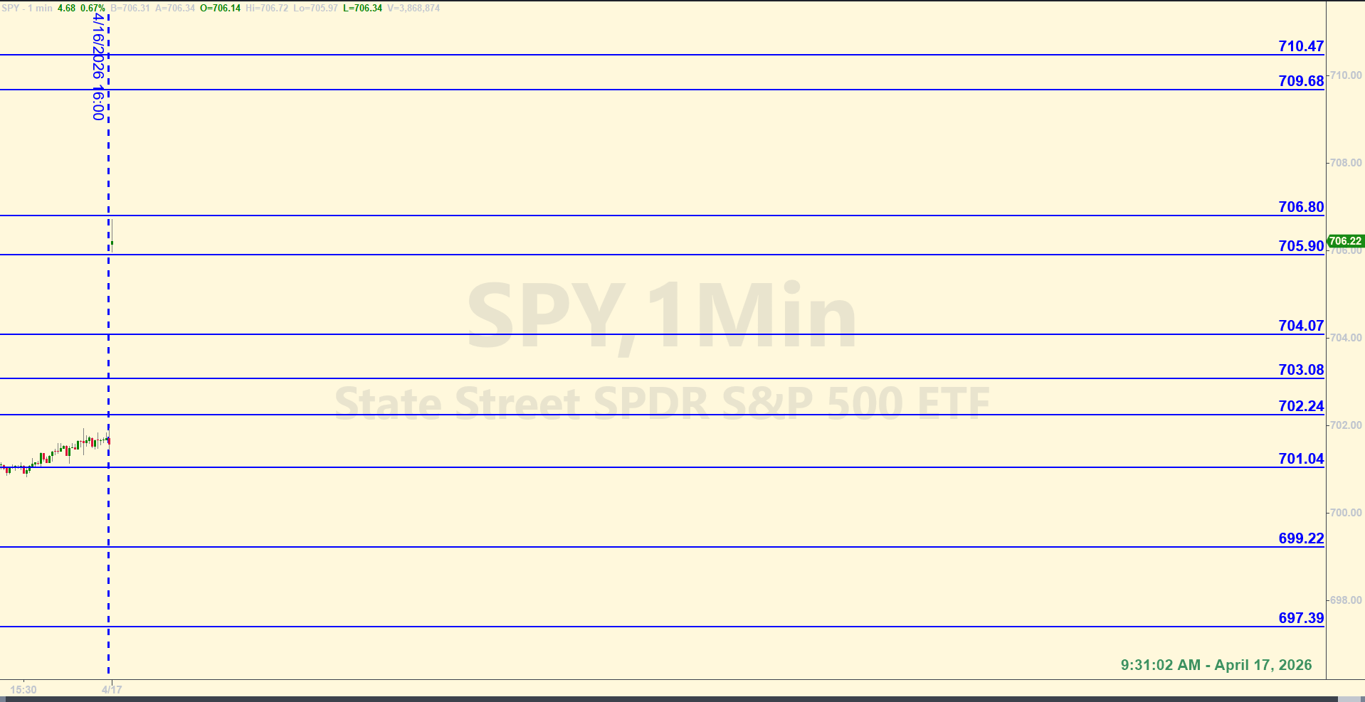 9:42 am: There was a level I used in the premarket to pull more than a handful of points on a short position. When price got back under 707.35, there was increased pull to the downside for a bit. Now at about 9:43 am, price is still trying to get back on top of 707.35. If the bulls can do it, they'll try to target the levels we have higher up starting at 709.68.