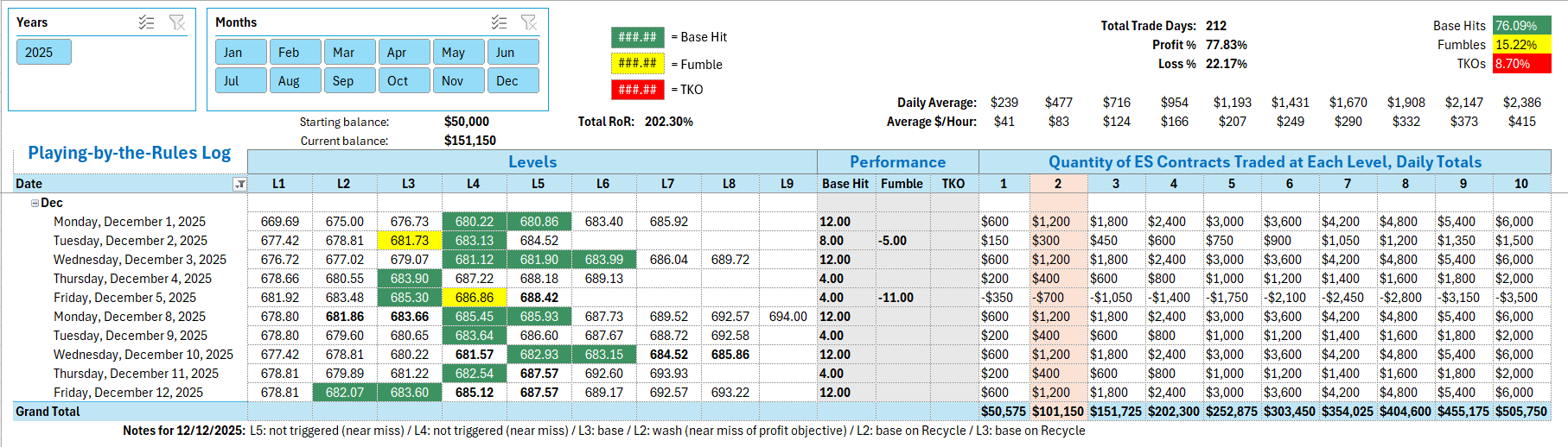 The first official Base Hit trade was a long at 683.69. A Recycle Trade at 685.12 was not entered either because not enough time elapsed - although you can see the level was resistance on the other side as price fell away from it. You went long at 682.07 and jumped out for a wash when price gave a Near Miss of the profit objective. Sticking to the process kept you from staying in that long position as price continued lower. The Recycle at 682.07 worked as designed for a short trade at 12:09 PM. The Recycle at 683.60 on the short side bagged another Base Hit. This gave you three Base Hits today. After that, the continued interaction with price at the levels were complete. No more trades, because they had been satisfied on both sides of the tape. And officially over 200% Rate of Return for the year as of today.