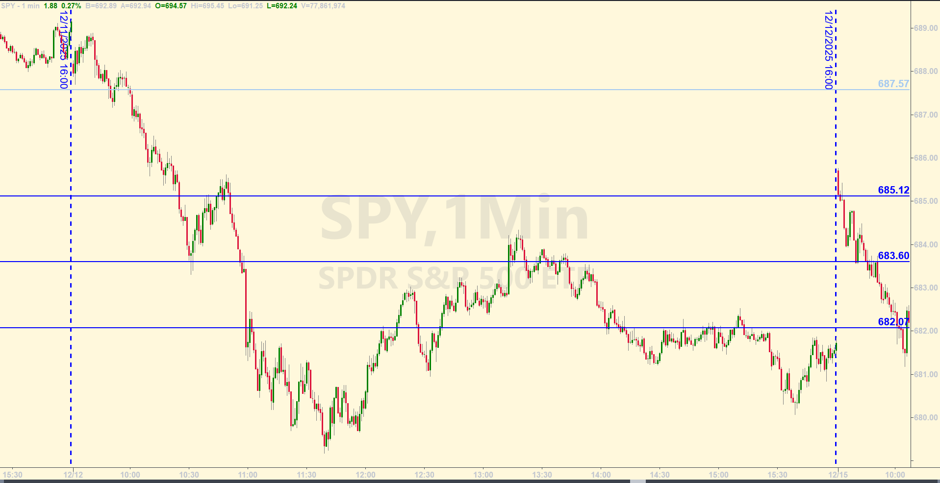 For today, we have price in the premarket still fighting to stay above yesterday’s axis level and currently, with about 30 minutes left until the opening bell, as I write this, the bulls are fighting Thursday’s close at 689.17. They’ll need to establish closes above 689.17 to keep the bullish behavior intact. We will use 689.17 as the bull axis for today. Staying above with 15-minute, 30-minute, and hourly candle closes is good for the bull case.