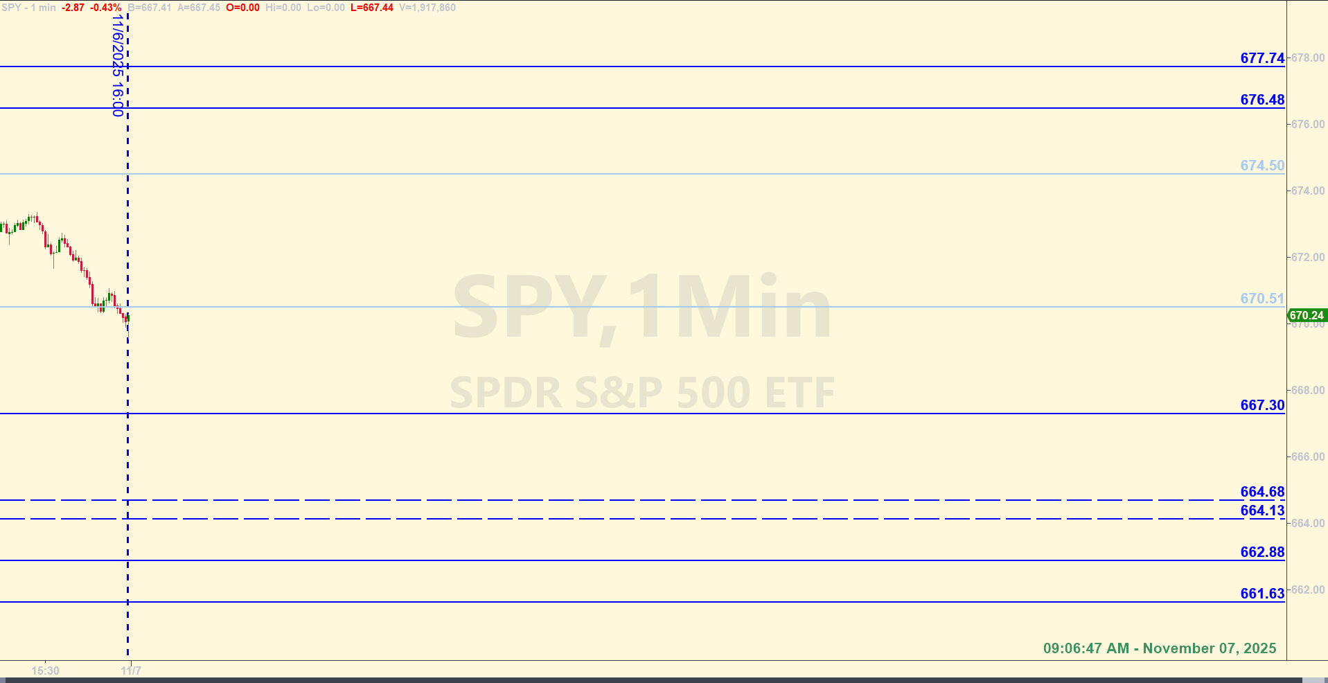 The bear axis for today is 670.51. If price stays below that level, the bears are likely to be favored, and we’ll continue to see weakness. If price can get back above and close above 674.50 – which is the bull axis for today – then the bulls will likely have the strength at that point to climb. Both these axis levels are tradeable only if price approaches them correctly. Like, by the rules. Consolidating and going sideways under 674.50 for awhile, as an example, could be a clue that the bulls are building strength to bust through and go higher. So that kind of price interaction with the bull axis would go against a rule and therefore it would not be tradeable.