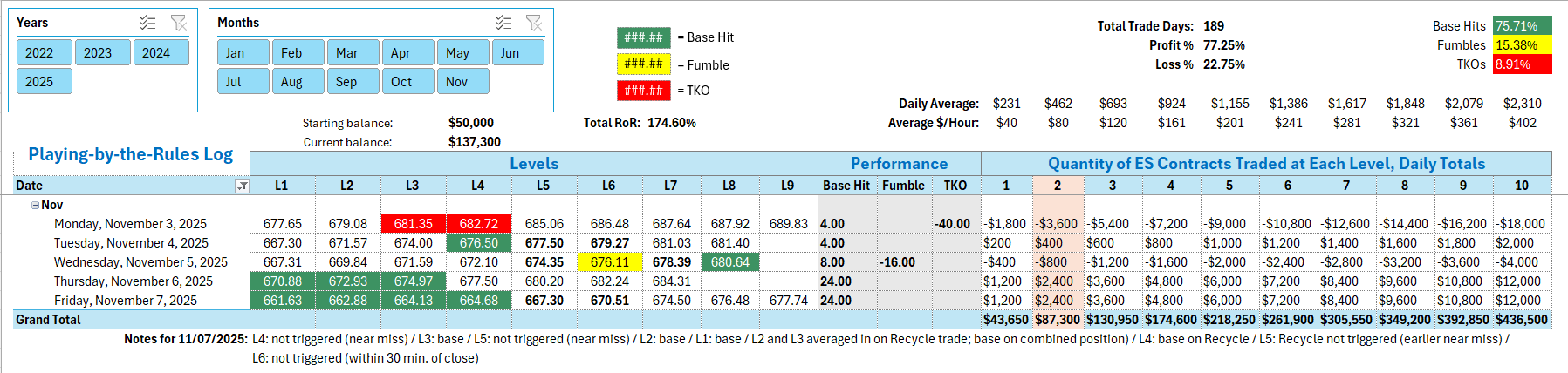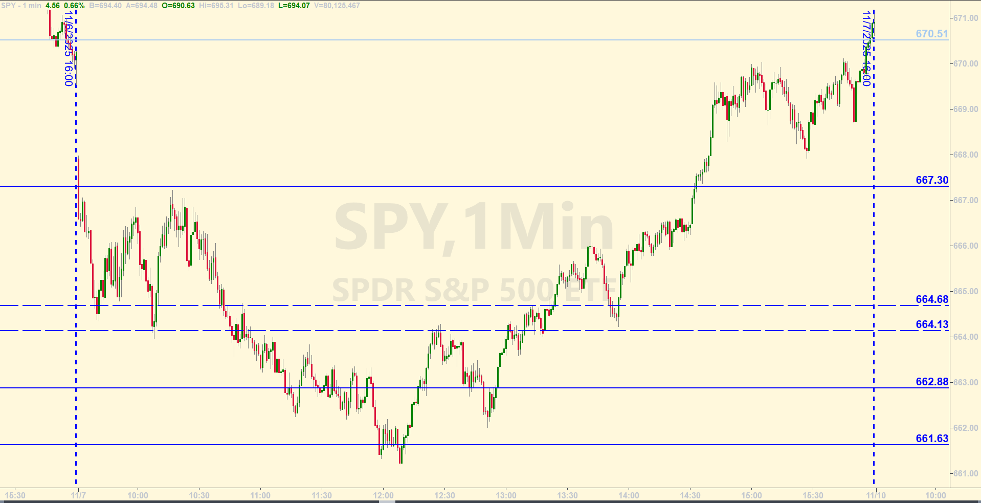 After our window opened after the first 15 minutes of the regular session (after 9:45 AM Eastern), the first trade would have been a long position taken in the ES when the SPY came back down into 664.68 at 9:51 AM. It did not trigger because of a Near Miss. The level at 664.13 was the first official base hit when price bounced there. When price came up into 667.30, it was another Near Miss. No trade entered. We're not trading 664.68 and 664.13 again on the long side - they've already been traded on that side for the day. So down to 662.88 and there was the the second Base Hit trade with the bounce there. Also at 661.63 with a third Base Hit. On the way back up, per the rules going short at 662.88 and 664.13 was valid. Both levels would have been averaged in and a Base Hit on the combined position for that trade. That was Base Hit numbers 4 and 5. Another Recycle Trade at 664.68 on the way up. There was a reaction enough to give a Base Hit on the short side there - at about 1:13 PM. That was the sixth and final Base Hit trade for the day. When price got up to 667.30 again, there was no new attempt at a short trade, per the rules (the first hit is the best hit). And then up at 670.51 was a no-trade because the level was hit just a few minutes before the closing bell, and we don't enter trades within the last 30-minutes of the closing bell using the Ticks & Trades strategy.