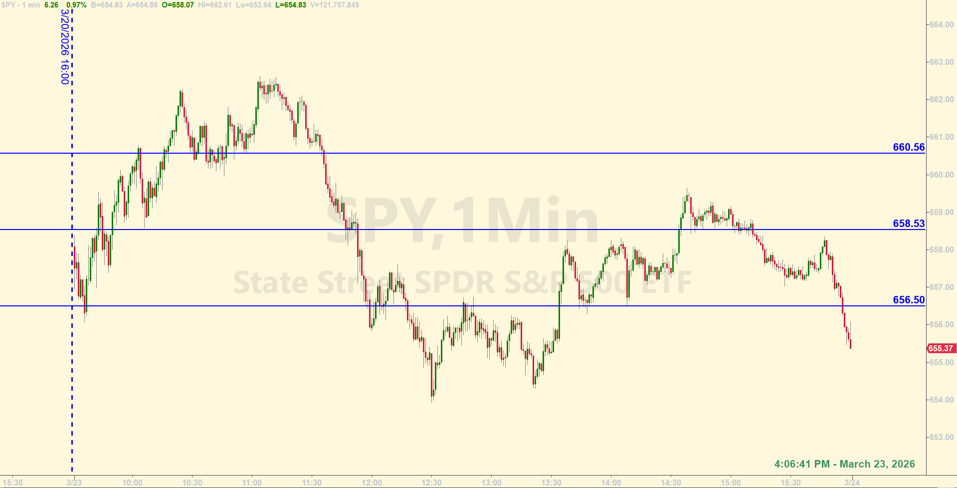 And by the way, if you're wondering about the level at 658.53 when it was hit again from the underside at 2:34 pm.. would you have taken that short trade? No, for two reasons. One, because you already shorted that same level early in the regular session, right after the 9:45 am window of opportunity opened. And second, notice the 20-20 consolidation that happened starting at 1:38 pm and continued until the level was hit at 2:34. Those tests of the level where price got to around 20 cents of the level several times (more than 20 minutes), was the market's way of telling you that if price were to get to the level, it would probably not act as resistance anymore. Or at least enough resistance. In this case, price was eventually rejected by that level and was forced lower, but we only follow the rules here. It takes the guesswork out of trading.