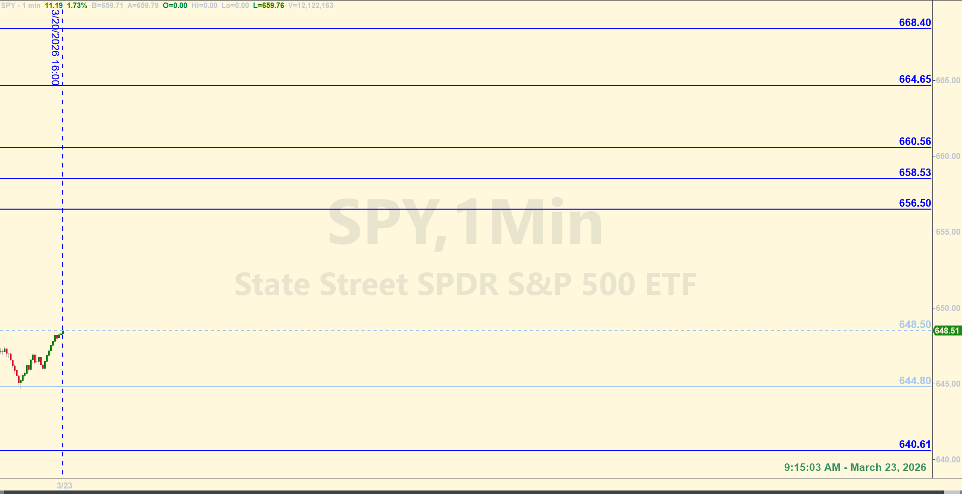 The level at 648.50 is around where the SPY closed last Friday. It could mean something if price gets down that far today, but it's not a tradeable level by default, unless other confirmations are present at the same time. The bigger line in the sand that the bulls would really need to defend if the bottom falls out today is 644.80. Staying above is ok for the bulls for the time being. Getting below and closing below 644.80 - especially daily closes - isn't good for the bulls.