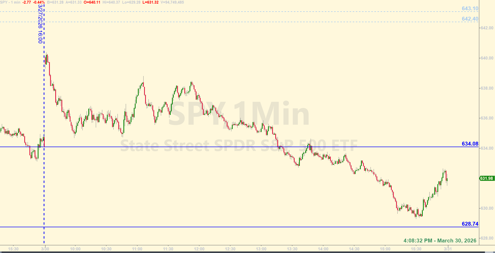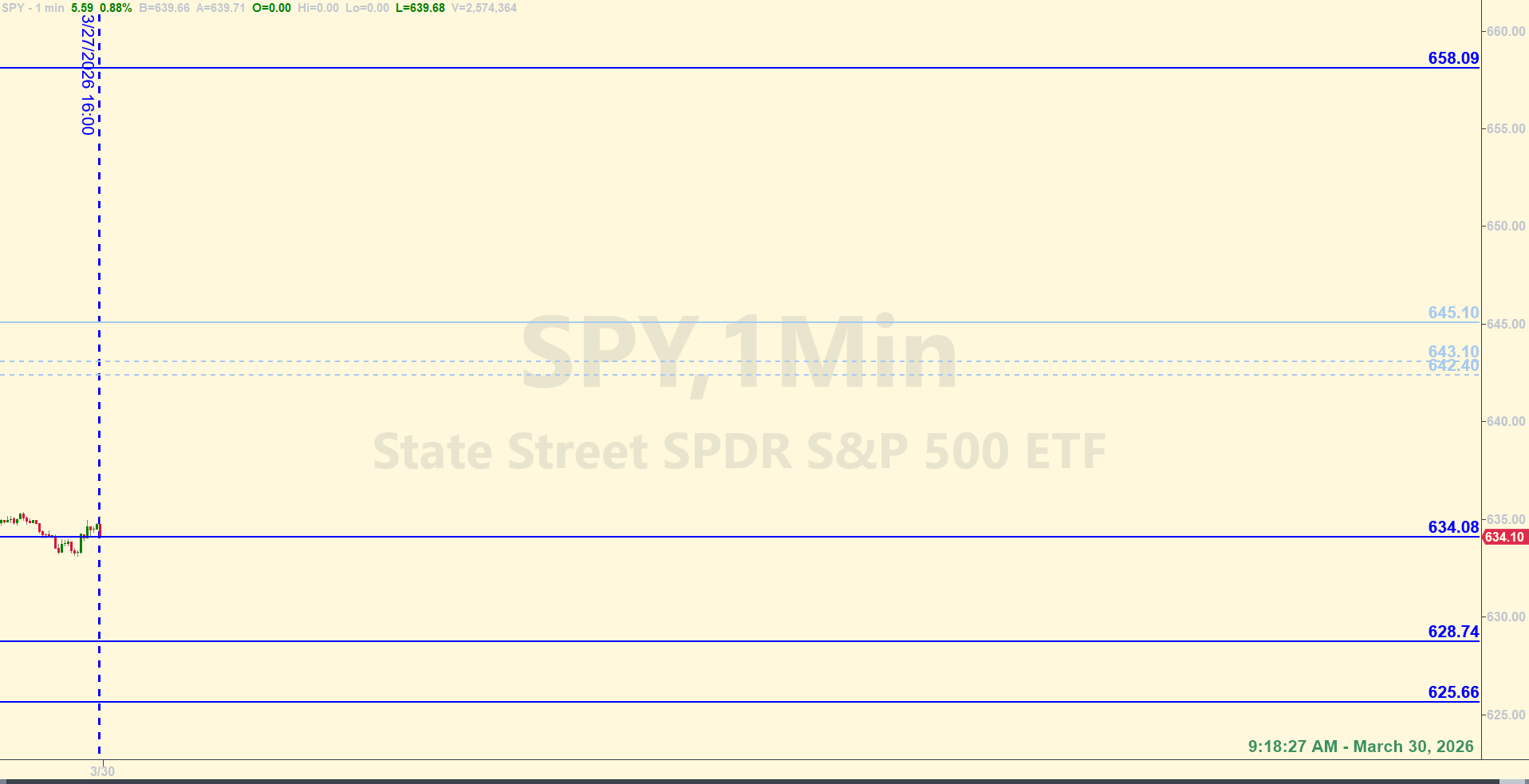 As far as the levels today, they are relatively spread apart. The aforementioned zone is one area the bulls want to get on top of. If they can, there's an axis level at 645.10. That's a gap left open from last Thursday's close. It could represent at least some interim resistance if the bulls get up there today. Closing multiple candles of significance above 645.10 opens the door for the bulls to possibly drive price higher. There may be other levels of possible resistance above that axis level of 645.10, but nothing I'm comfortable with including on the board today until 658.09.