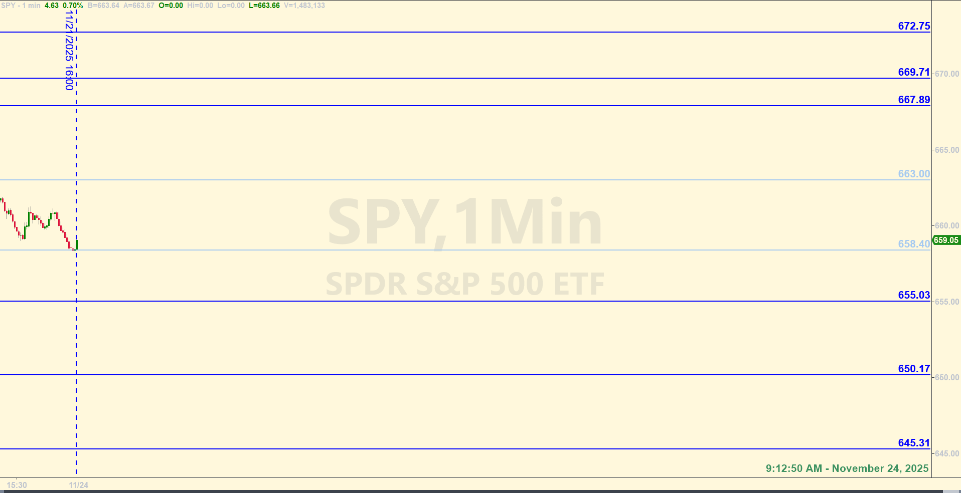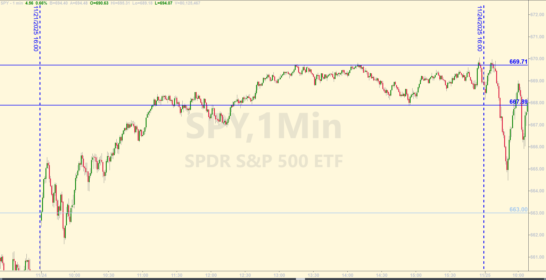 With this week being a short week, and price back in the middle of stuff, anything can happen. But markets tend to slow down around major holidays. So, we’ll see. The bull axis for today is 663. Price has been hanging around that level in the premarket. The bulls need hourly closes above 663 to be in a better position to climb.