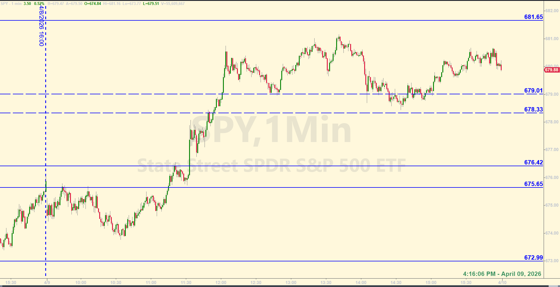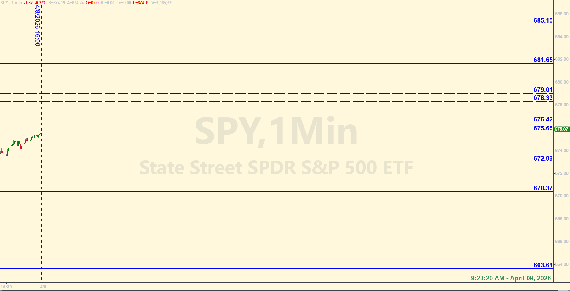 We had a zone on the board yesterday above where they opened. Price never got up to the zone yesterday. For today, that zone has expanded a little. The extremums of the zone are the levels 678.33 and 679.01. In the middle of that zone is 678.70. That was the top of the zone yesterday, and may still be important today, if price gets up there. 678.70 is not shown in the list of levels above and in the screenshot below, just be aware that it's there and the whole are should be decent overhead resistance. If the bulls can get above that zone, that's a good sign they have more steam left to grind higher. If they get rejected there and price falls back, that would just be the zone doing its job as overhead resistance.