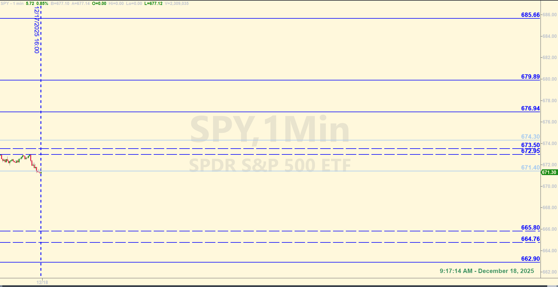 9:17 AM Eastern - The trendline is in the spotlight now. Notice the zone between 673.50 and 672.95. That is where the trendline is for today. It also happens to be in the same area that served as an important axis many times in the last couple months. Remember the 673 to 674 area where the SPY topped out and then fell from on October 10? Once price gapped above that area on October 24, the bulls and bears have been fighting that area and trying to establish dominance above or below. Interesting that price was pulled down back below that area on a day when the trendline lined up with the same axis area. This price action over the past couple months is creating the ingredients for a longer term rollover. Look at the weekly and monthly charts of the SPY. They need to get at least one or two weekly closes above 690 and then a monthly close above that area before the possibility of a rollover is off the table.