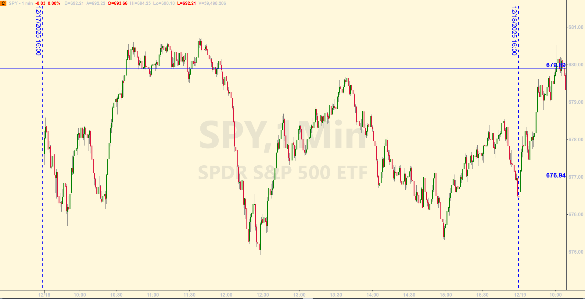 First Base Hit was the short at 676.94 at 9:48 AM. A Recycle Trade at that level on the long side could have been attempted at 10:12 AM, but being precise about it and sticking to the rules, it was one minute shy of being the right time for that window of opportunity open. So no Recycle Trade at 676.94. The short at 679.89 at 10:38 AM was closed out at breakeven because of a Near Miss of the profit objective when price dipped into the money at 11:30 AM. Jumping out at a wash was the plan. No other trades per the rules when price interacted again with 676.94.