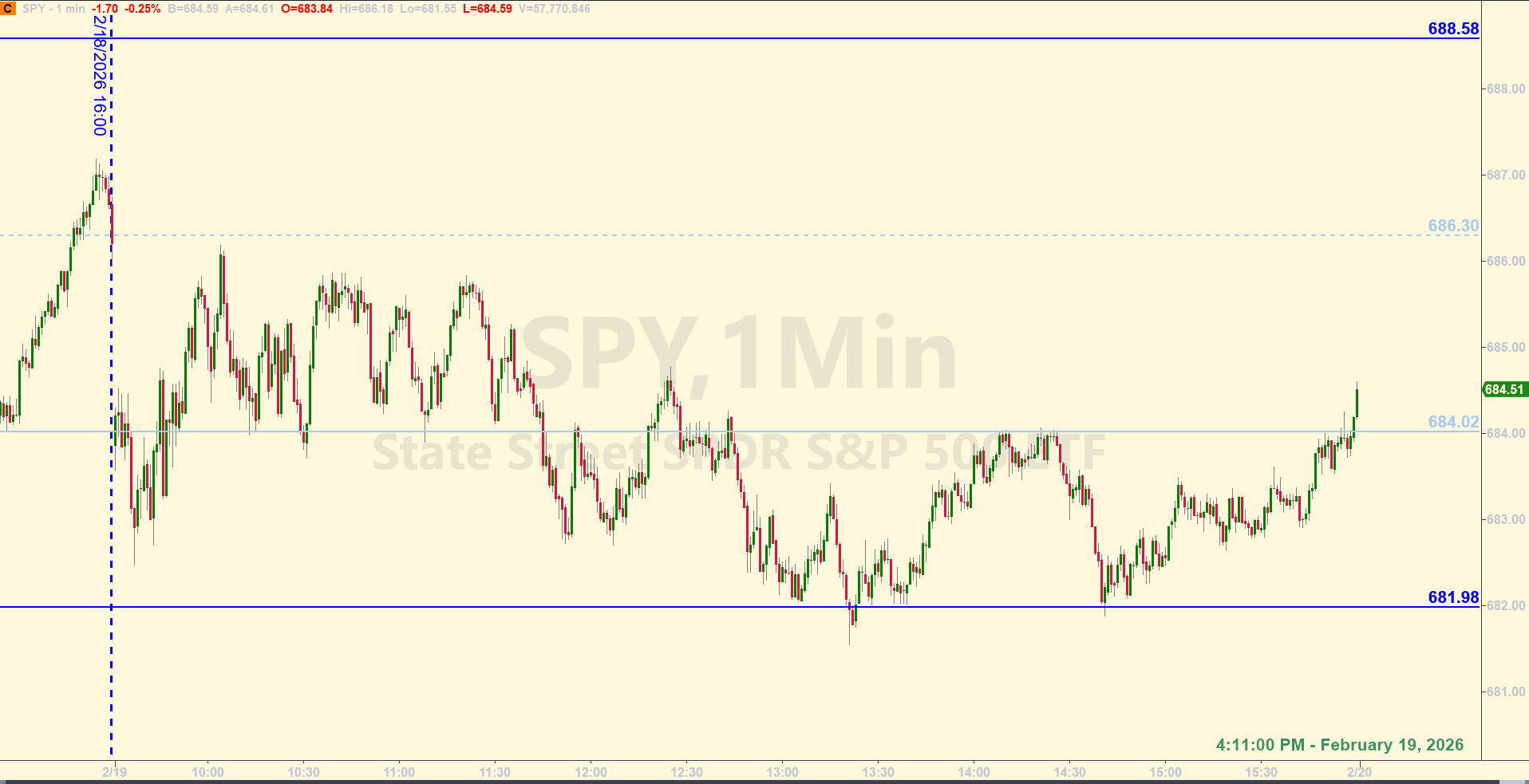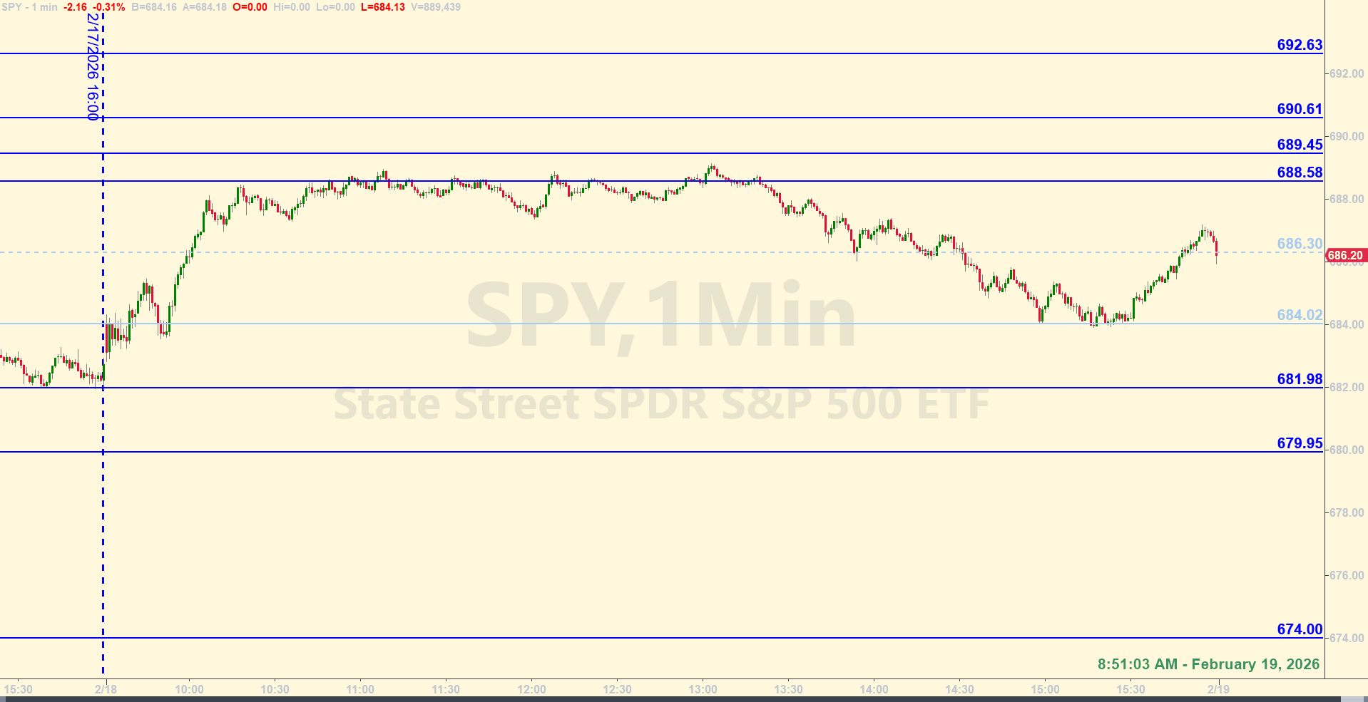 Note: the screenshot above does show the levels for 2/19/2026, as identified before the opening bell, but the vertical line that delineates the market close time at 4:00 pm Eastern was not advanced to the end of the prior day (2/18/2026) per usual. The price action you see on the chart is from the prior day, 2/18/2026.