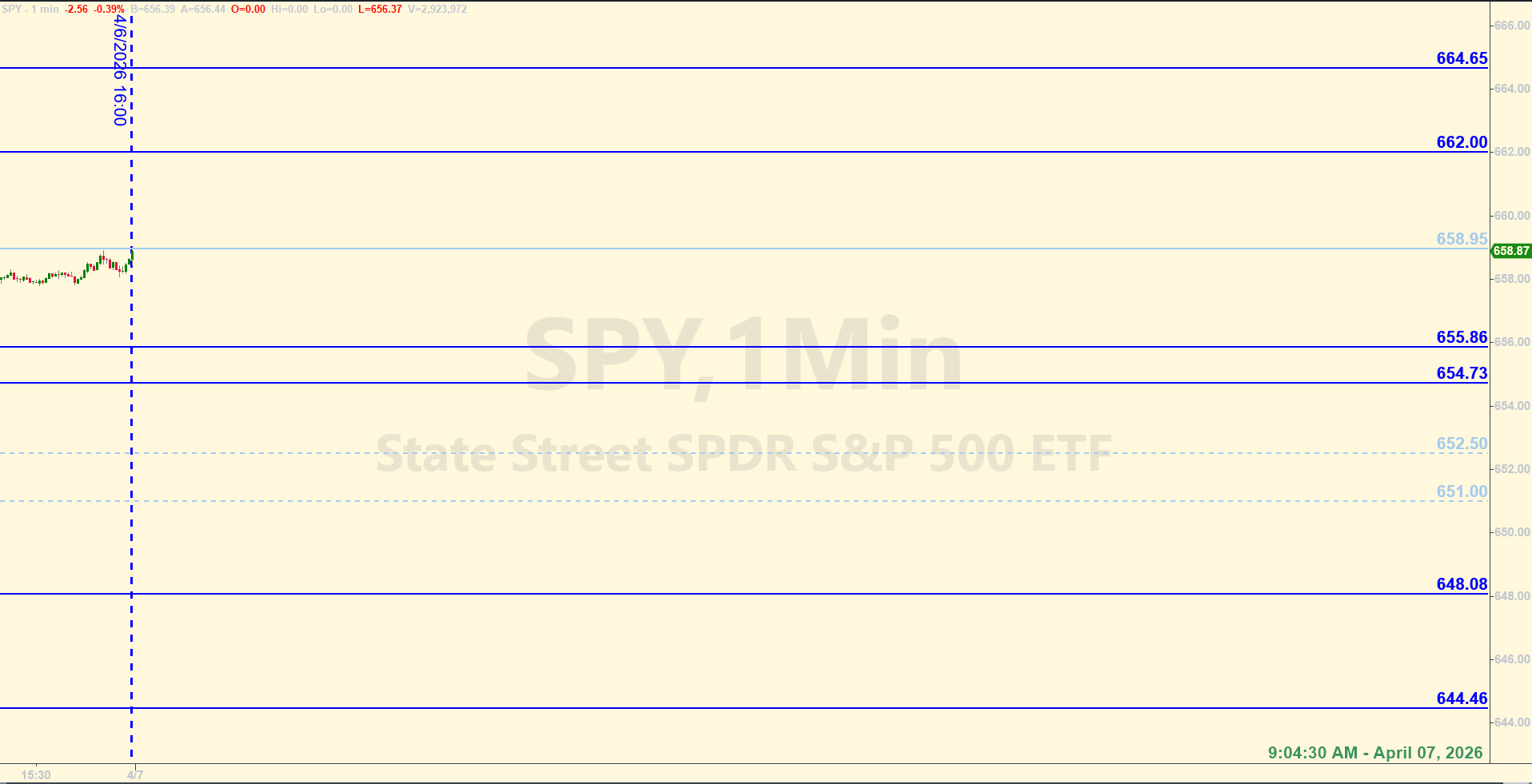 9:04 am Eastern - Price in the premarket has pulled back a little, but they're still on top of the trendline. For today, that trendline runs from about 652.50 at market open down to about 651.00 by the closing bell. The dotted light blue lines represent the area of the trendline for today, but the levels themselves are just the top and bottom of the trendline. So if price gets down into that area today, it would be best to understand where in the entire range of that slope where price is in relation to the actual trendline. It might help to plot your own trendline using the above coordinates.
