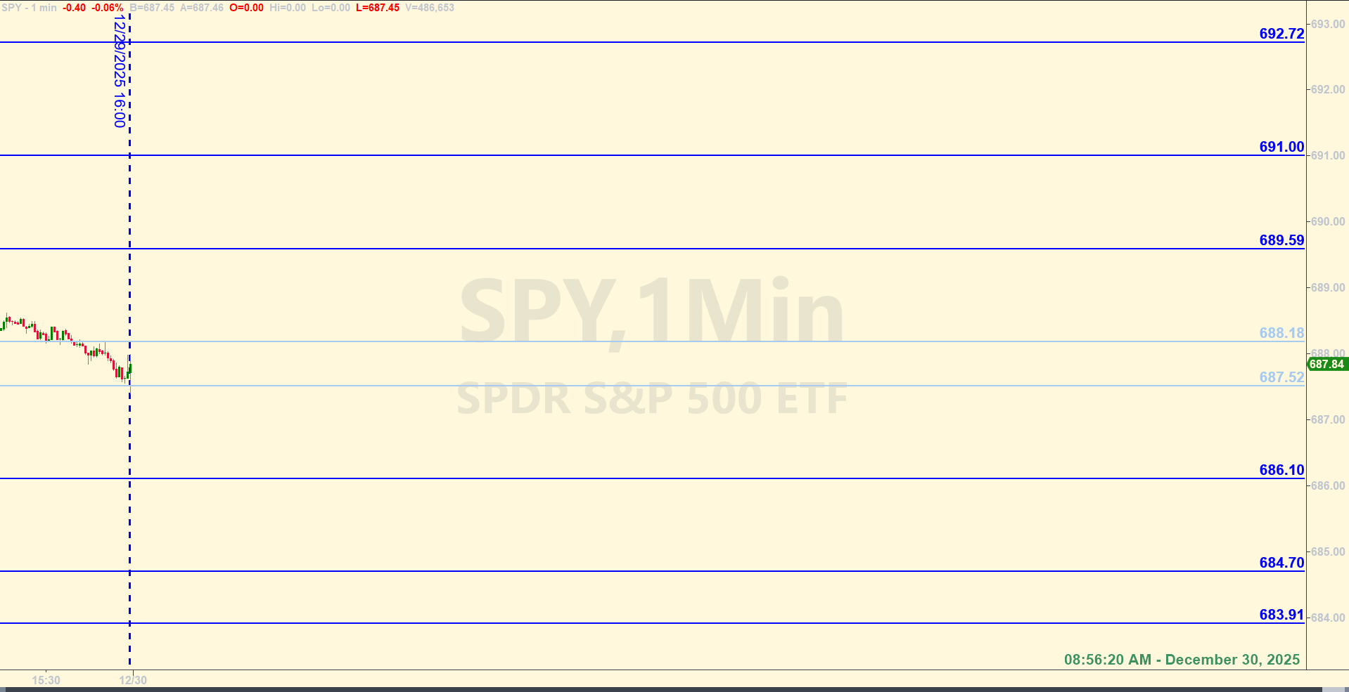At the close of the 9:45 AM candle, price was under the bear axis of 687.52, but they reversed it and drove price higher, through 687.52 and up to the bull axis at 688.18. Your short position that was triggered in the E-minis when the SPY hit 687.52 at 9:49 AM was added to with the same number of contracts when price hit 688.18. That averaged-in position handed over a quick Base Hit as price fell. You pulled the profit while price was under 687.52 so there was no Recycle Trade on the long side. Also, the timing wasn't lined up exactly right when price came back down. No more trades at both those levels already hit.