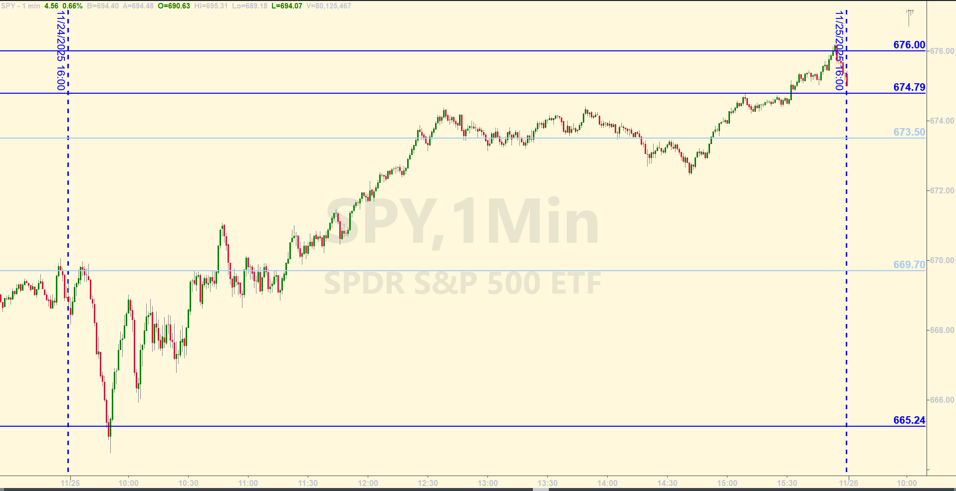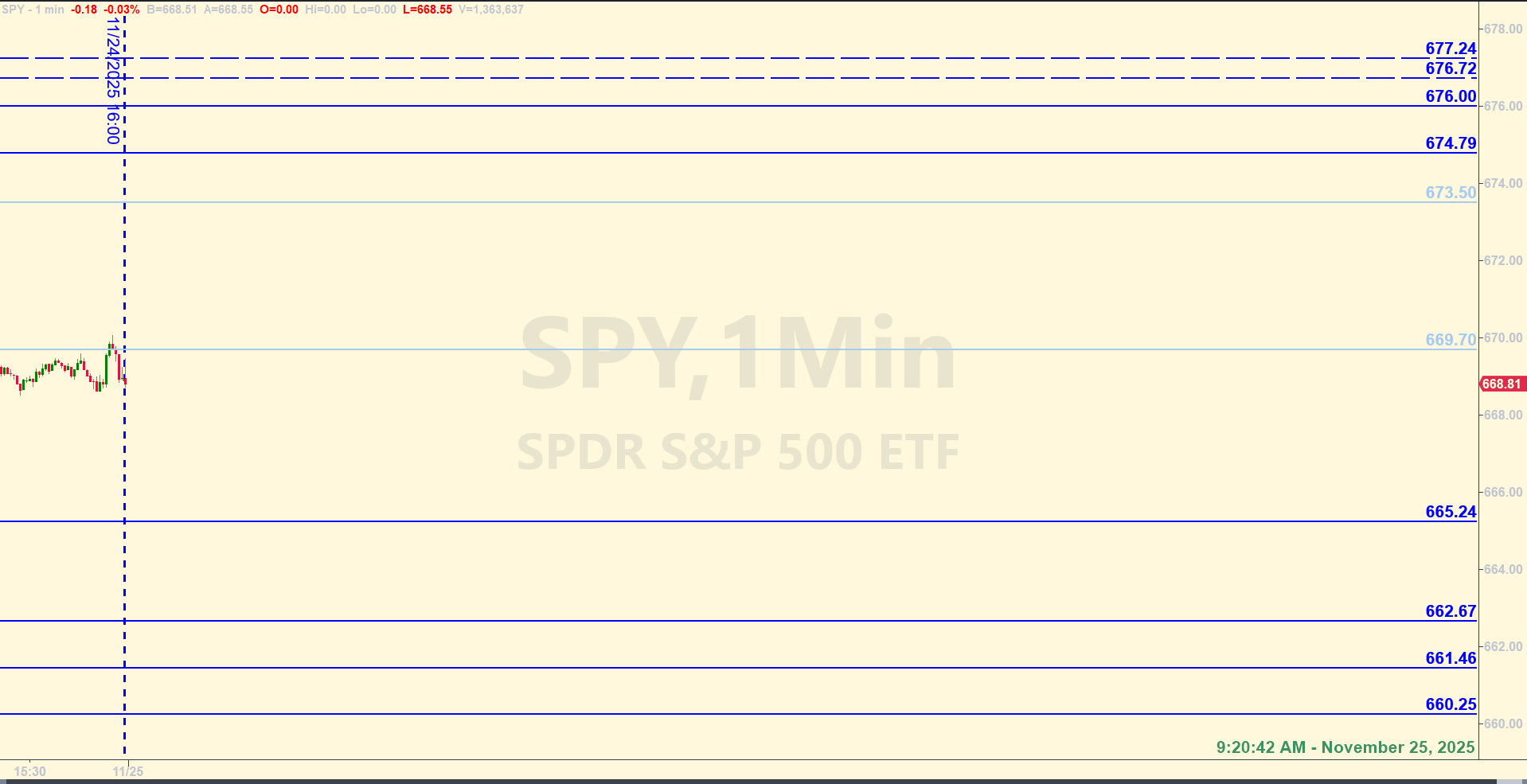 9:20 AM - If price stays below 669.70, the bears could have an easier time pulling price down some more into support. The bulls will need to get price above 673.50 to be more in the clear to try to climb out of the pull back we’re currently in. There are levels of overhead resistance above 673.50 they’ll need to contend with before having the space to run. Right now, price is still in the middle of stuff. Considering this is a holiday week, where volume is likely to dry up starting tomorrow, it’s more likely nothing crazy will happen. But don’t get complacent. The market has a habit of doing the thing when you least expect it.
