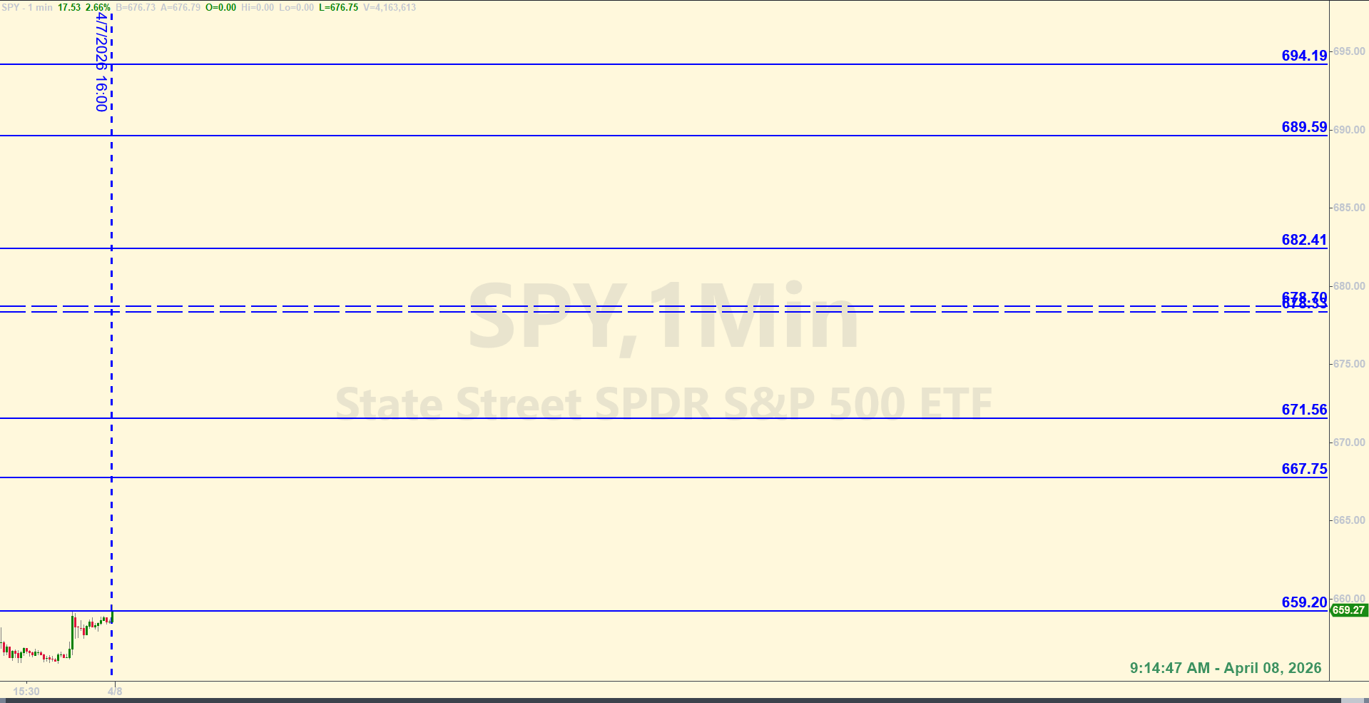 Let's talk about SPY 671.56 for a moment. When the regular session opened this morning, price had been on a rally in the premarket. They opened at about 676.39. Over the next 90 minutes or so, price dropped lower and came into one of our levels for the day. That level was 671.56. Almost 50 S&P points lower than where price opened, and when price got down there, that level represented very good support. Price bounced from that level and took off from there. The level was the low for the day.