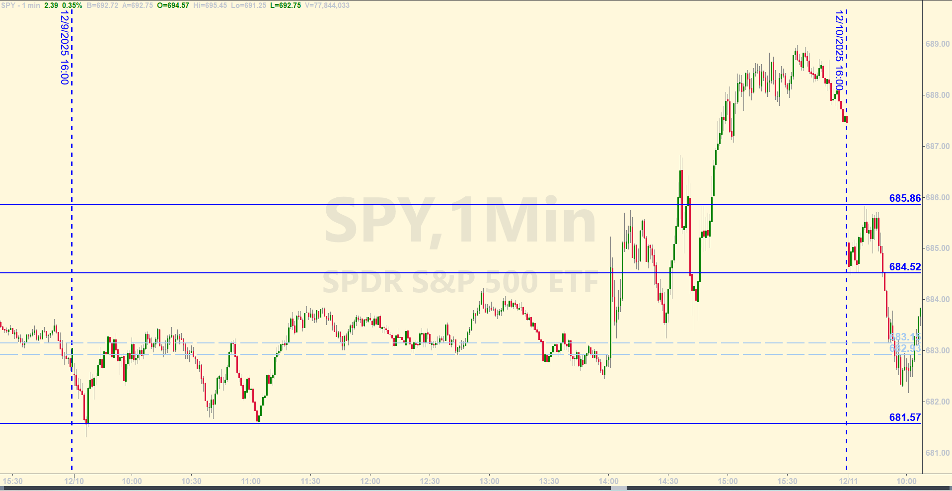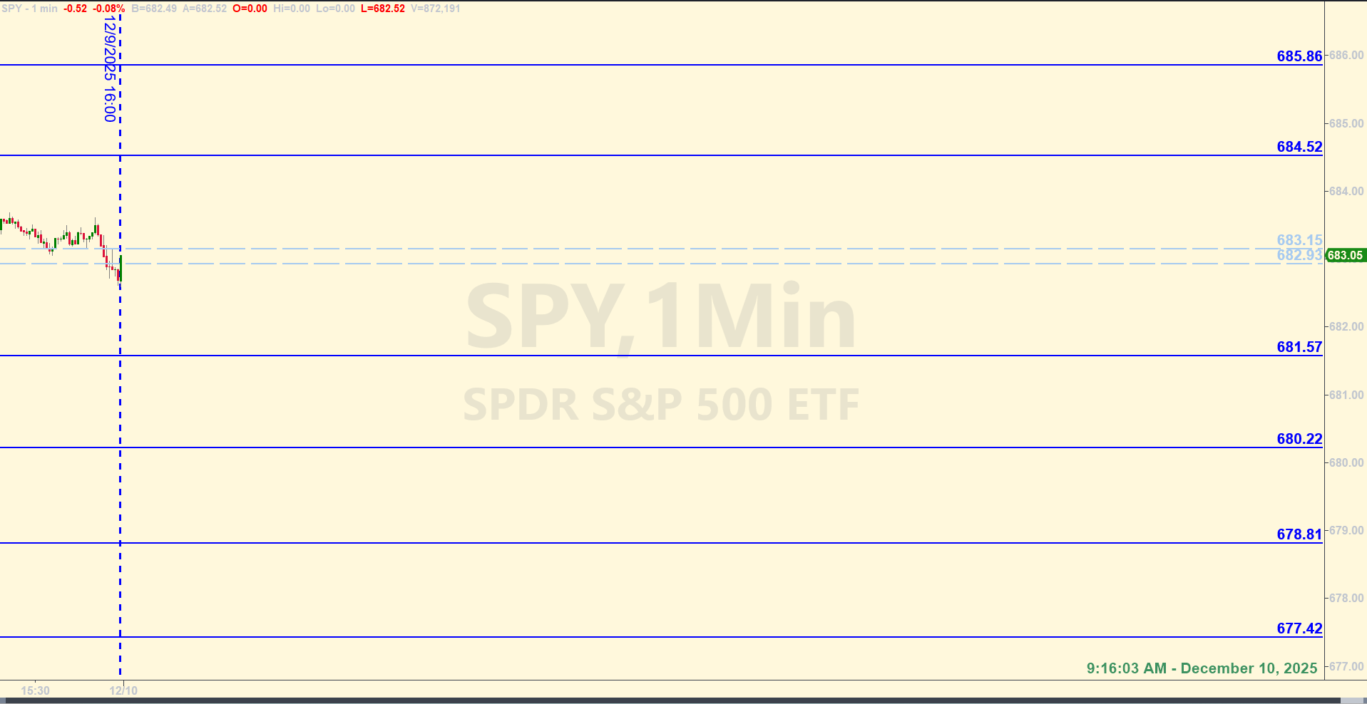 The levels for today are straightforward. Typical and usual areas of probable support and resistance. There is a zone between 683.15 and 682.93 that is the axis area for the day. Anything can happen at 2:00 PM and later, but for the morning, at least, if price stays below this zone, the bearish sentiment is likely to remain. If the bulls can get price above the zone and close 15-min, 30-min, and hourly candles above it before 2:00 PM, that might be sign that price is trying to bounce from that area.