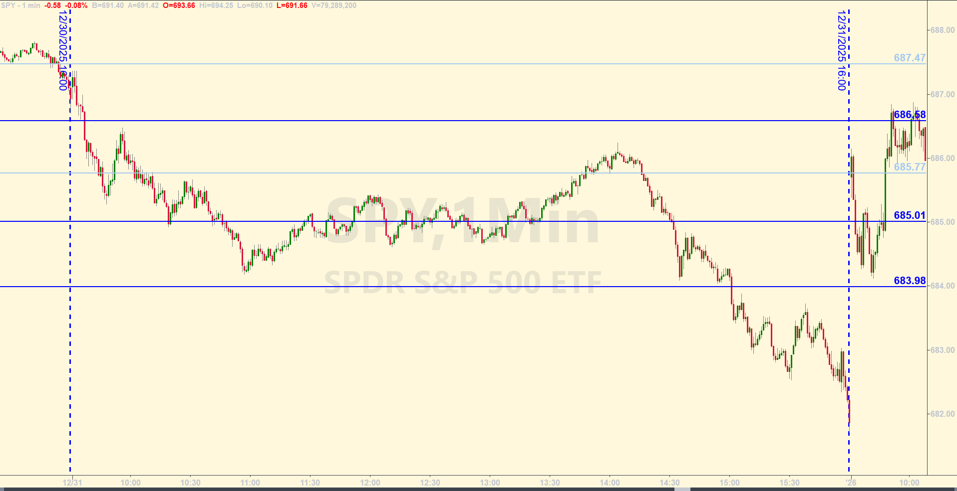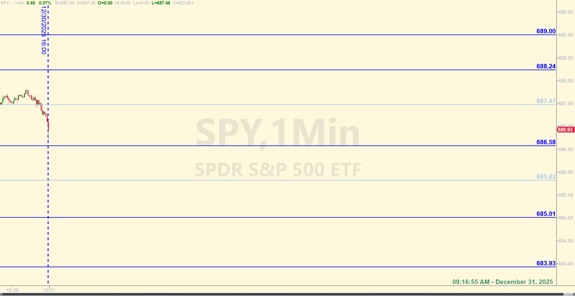 Closes above 687.47 and the bulls can still grind out of this pull back. It’s the same story as yesterday. Volume is likely to be low on this day-before-a-major-holiday trading session. It’ll be interesting to see where the close the SPY on the last day of 2025, which is today.