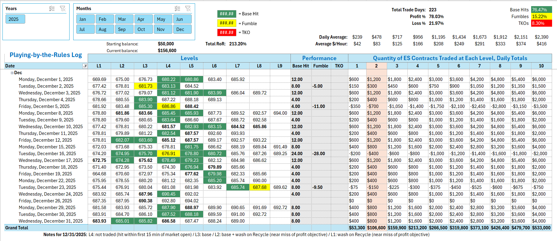 Quick reminder: on the Tracking Log, the rate of return ("Total RoR" metric) assumes a $50,000 starting balance at the beginning of the year, and two (2) ES contracts traded at each level, per the Ticks & Trades rules.