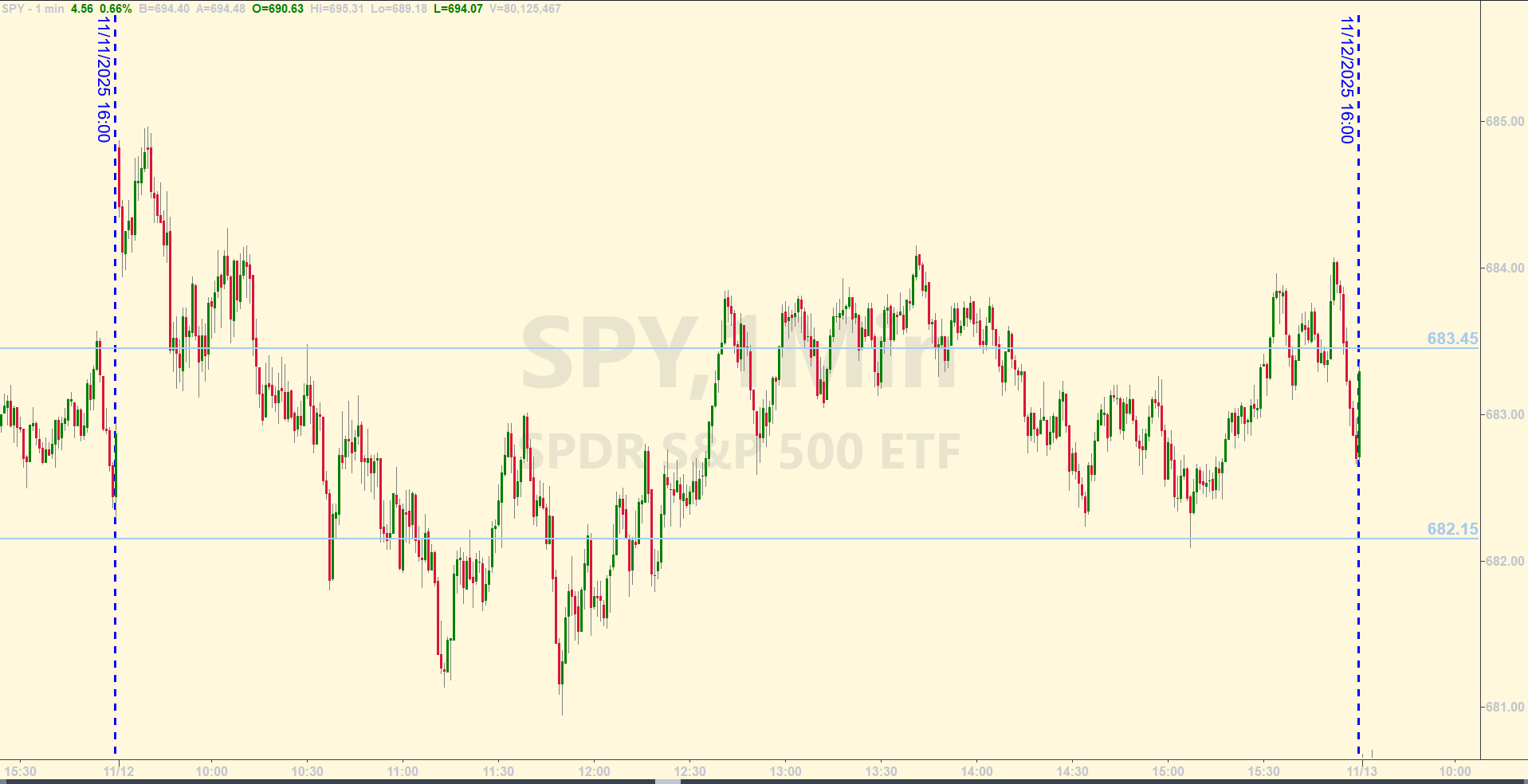 First trade was on the long side with the bounce at 683.45 at 9:47 AM Eastern. Price got under the level and tested it from the underside at 10:30 AM. That was not traded on the short side as a Recycle Trade because there wasn't enough time from when price got under the level and when the other side was tested. Next official Base Hit trade was at 682.15 on the long side. At 10:37 AM, they hit the level and a minute later they bounced more than enough for a 4-point Base Hit. No Recycle Trade at 682.15 after price got under it and tested it on the other side - because of the same reason as the other level. It's clear to see how both levels were important all day.